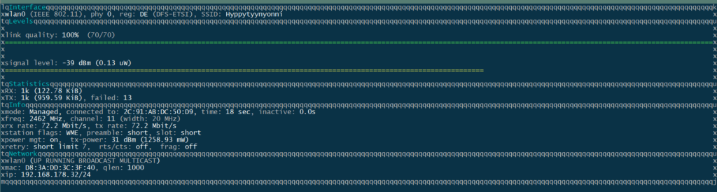 Obwohl der Zero 2 W Linkqualitäten von 60-80% und über 30 Mbit Bruttogeschwindigkeit anzeigte (was für einen 4 Mbit Stream theoretisch reichen sollte), war die Verbindung instabil.